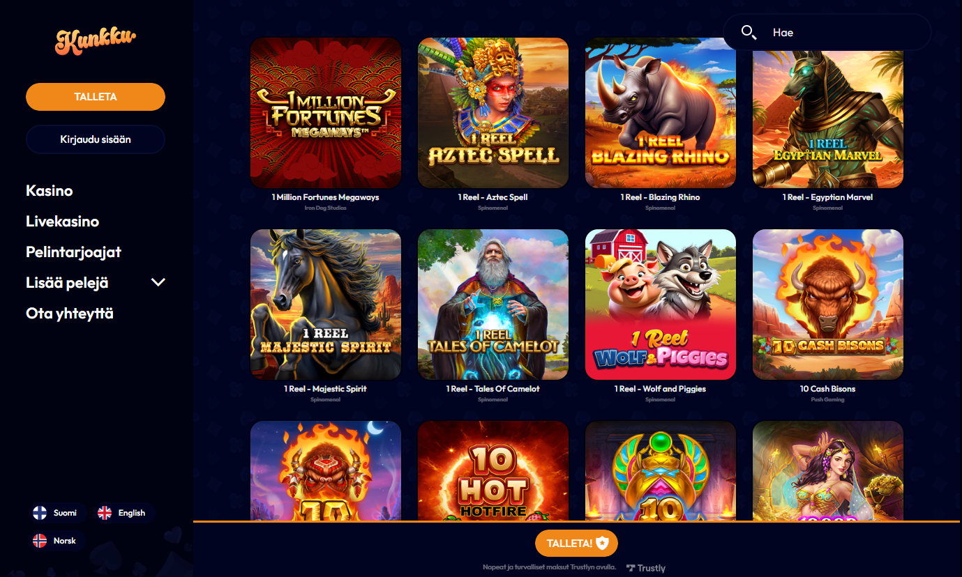 With instant deposits and withdrawals, Trustly-powered Pay N Play functionality, and a diverse selection of games from top providers, Kunkku Kasino delivers smooth performance and total convenience. Add to that transparent bonuses, responsive Finnish support, and strong encryption, and you have one of the most trustworthy options on the market.