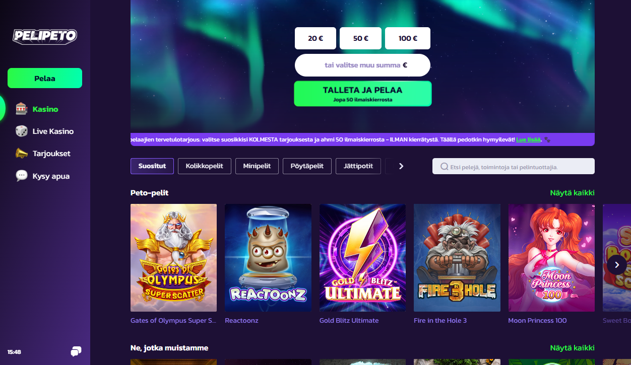 Pelipeto Kasino is an excellent option for players seeking fast, registration-free casino play with trustworthy licensing and appealing bonus structures. The 0× wagering free spins in the welcome offer set it apart from many competitors. With a solid game library, regulated licensing, and smooth payment methods, Pelipeto delivers an attractive and balanced experience for Finnish players.