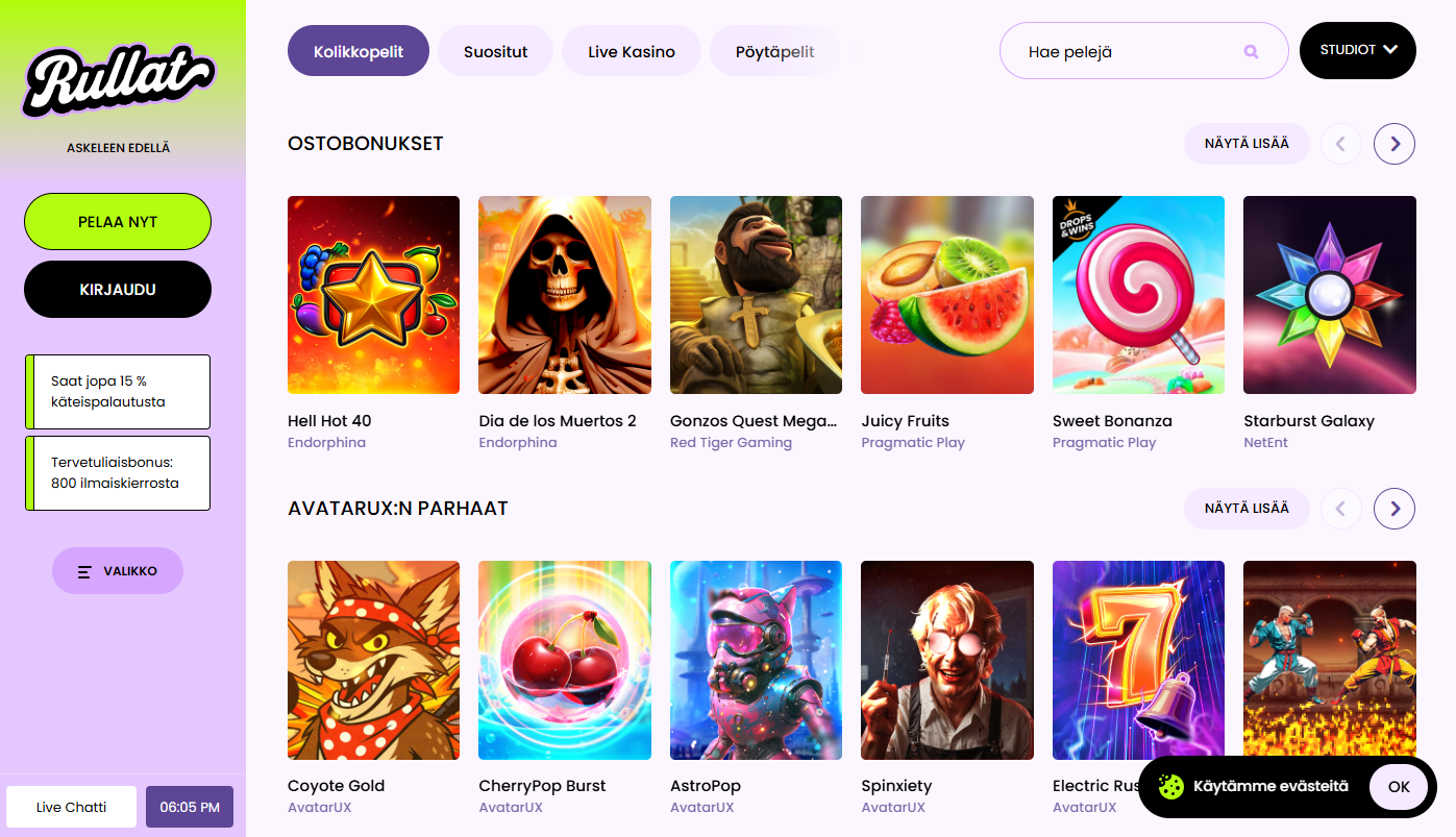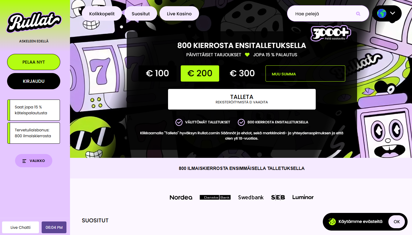 Rullat Casino is a fresh Pay N Play online casino launched in 2025, built specifically for Finnish players who appreciate speed, simplicity, and security. Operating under a Curacao eGaming license, Rullat Casino offers a vast selection of games, attractive bonuses, and flexible terms that suit both casual and experienced players.
