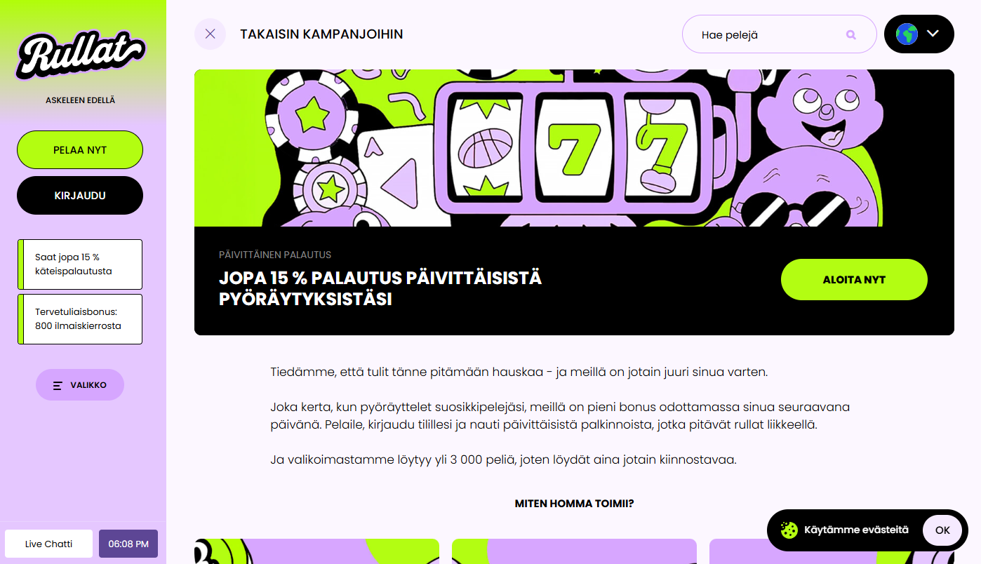One of Rullat Casino’s most appealing features is its cashback program, offering players consistent daily or weekly returns with very low wagering requirements. This gives Finnish players the opportunity to keep more of their real winnings without unnecessary restrictions.